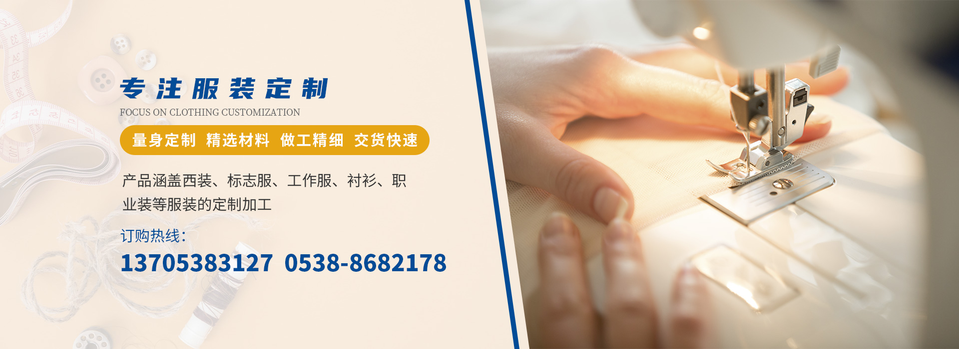 涵蓋西裝、標(biāo)志服、工作服、襯衣、職業(yè)裝等服裝定制加工,為不同客戶提供到位產(chǎn)品與服務(wù)